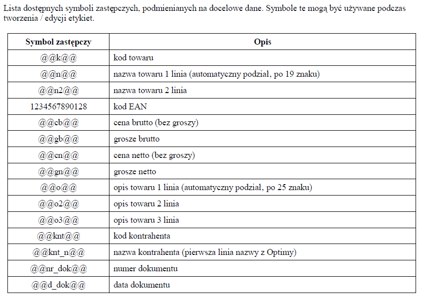 można drukować na podstawie kilku rodzajów dokumentów wraz z ceną ustawioną podczas konfiguracji. Za wzór wykorzystywany jest plik TXT z elementami etykiety. Aplikacja umożliwia ustalenie ilości drukowanych etykiet na podstawie ilości sztuk wprowadzonych w dokumencie lub podanie ilości etykiet "z ręki".